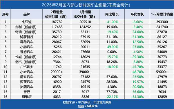 具体来看各新能源车企2月份的具体销量。