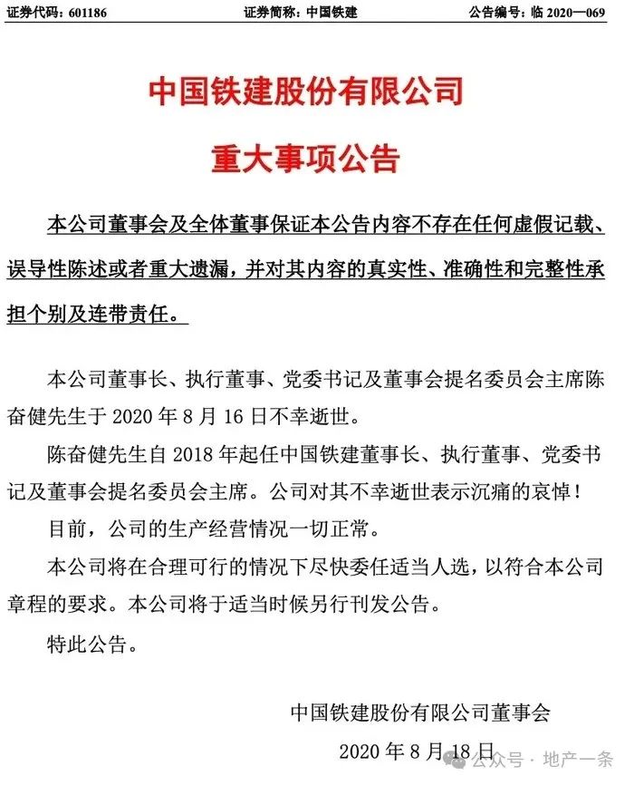 值得一提的是,2020年8月16日,中国铁建前董事长陈奋健坠楼身一火,官方莫得通报坠楼的具体原因。