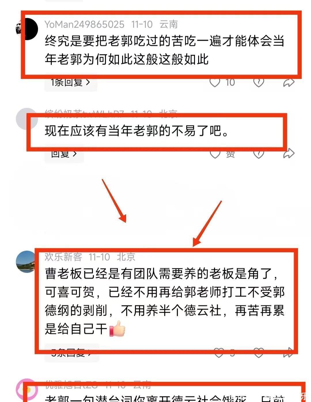 郭德纲这边倒是淡定得很,基本上不正面修起曹云金的事儿,偶尔发个长文也不提名谈姓,东谈主家当今身边岳云鹏这些门徒个个争光,谁还有闲时候甘愿一个早就不关系的前门徒?这待遇的差距摆在那儿,曹云金我方心里能不了了?
