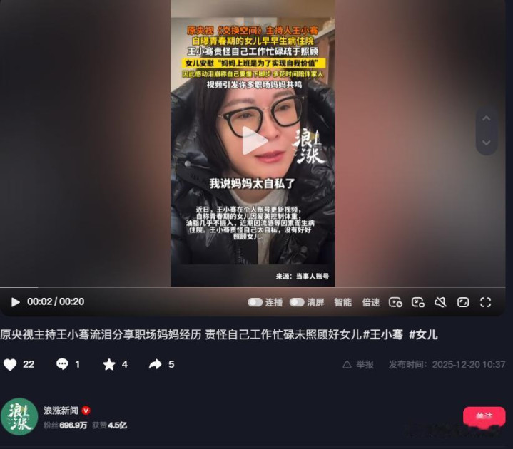 也曾在《交换空间》里看到优秀的王小骞,振奋粗糙行为也曾央视主抓东谈主,看到最近她公布的视频里感觉到作念母亲的无奈。