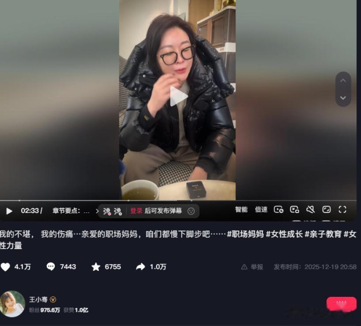 12 月 19 昼夜深,王小骞发布了一条视频,视频里她再也莫得畴昔职场女强东谈主的牢固淡定,反而潸然泪下,情谊崩溃到几度抽抽噎噎,以致没法顺空谈话。