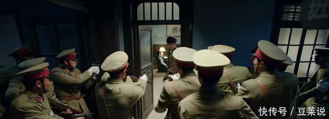 紧接着镜头切换到三灶岛,日军顽固全岛的敕令刚下,中方双面特工武木一郎(张鲁一饰)已顶着日本皇室访问员的身份登岛,每一句对话都躲避机锋,身份显现的风险出入相随。