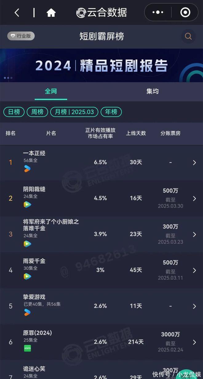 据云合数据,2025年3月短剧全网正片灵验播放市集占有率前三名为:《一册肃肃》《阴阳成衣》《将军府来了个小厨娘之落难令嫒》。