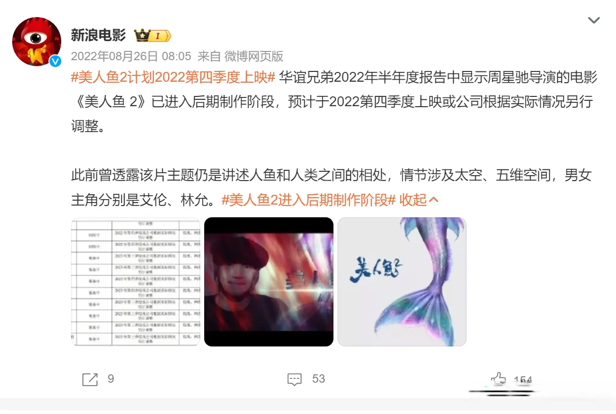 2022年华谊CEO王中磊被问到《好意思东谈主鱼2》,他示意 “殊效团队重组导致程度大幅滞后”,原方案2022年第四季度上映该片,最终未能罢了。