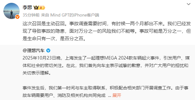 随后,@李想 发文:“这次调回是主动调回。事故访谒需要时候,巧合候一两个月王人出不来。咱们也曾发现了导致事故的隐患,濒临万分之一的风险咱们不成等。事故可能是万分之一,然而生命只好一次,是百分之百。”